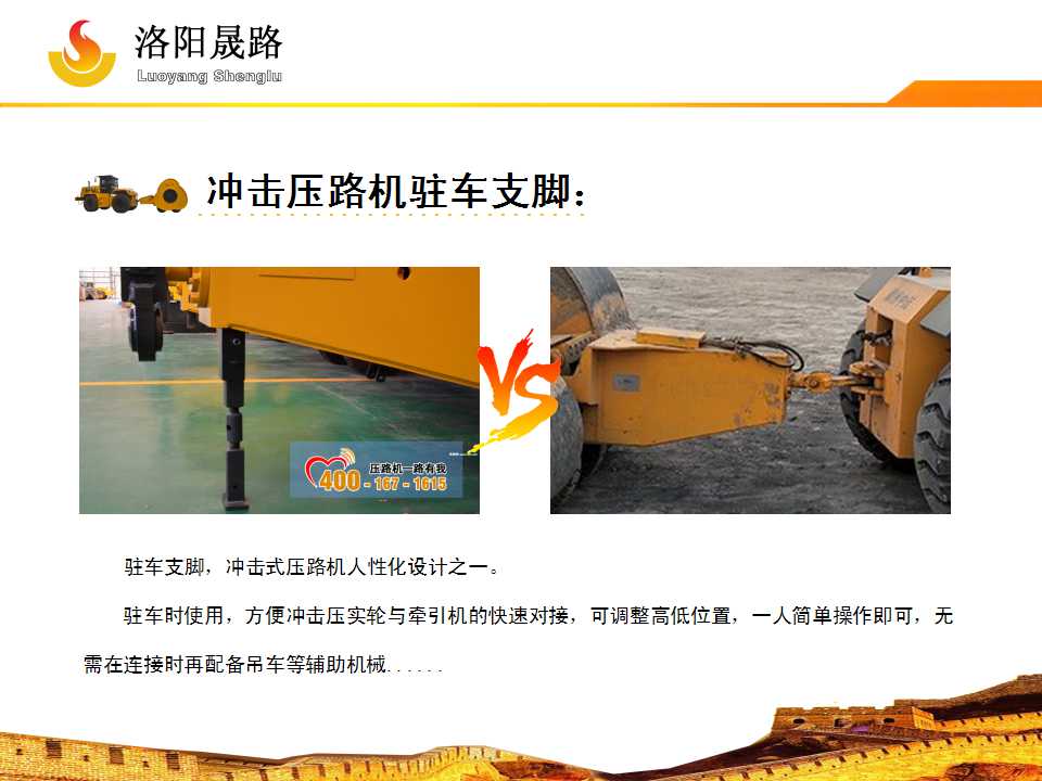 駐車支腳,同樣是沖擊式壓路機(jī)人性化設(shè)計(jì)之一,非必不可少,但駐車時(shí)使用,方便沖擊壓實(shí)輪與牽引機(jī)的快速對(duì)接,可調(diào)整高低位置,一人簡(jiǎn)單操作即可,無需在連接時(shí)再配備吊車等輔助機(jī)械,省時(shí)省力。