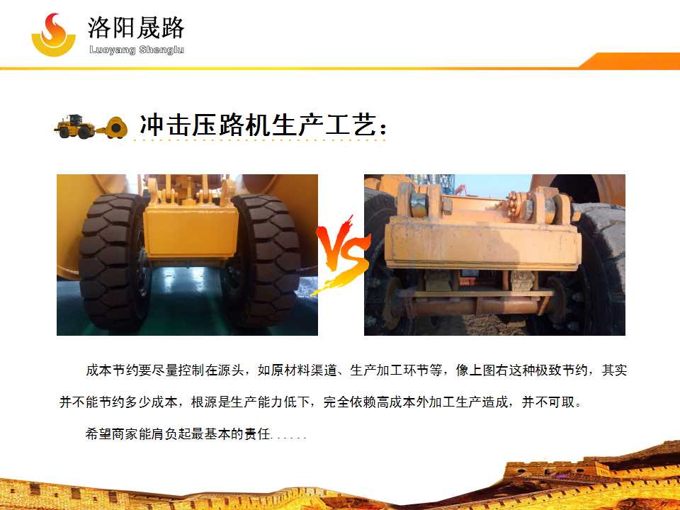 由于沖擊式壓路機(jī)內(nèi)在品質(zhì)不容易甄別,我們不妨可以通過成品的外形配置對(duì)比來簡(jiǎn)單識(shí)別下其品質(zhì),洛陽晟路認(rèn)為:如果商家連最基本的外觀臉面都棄之不顧,其產(chǎn)品內(nèi)在質(zhì)量又能好到哪里?