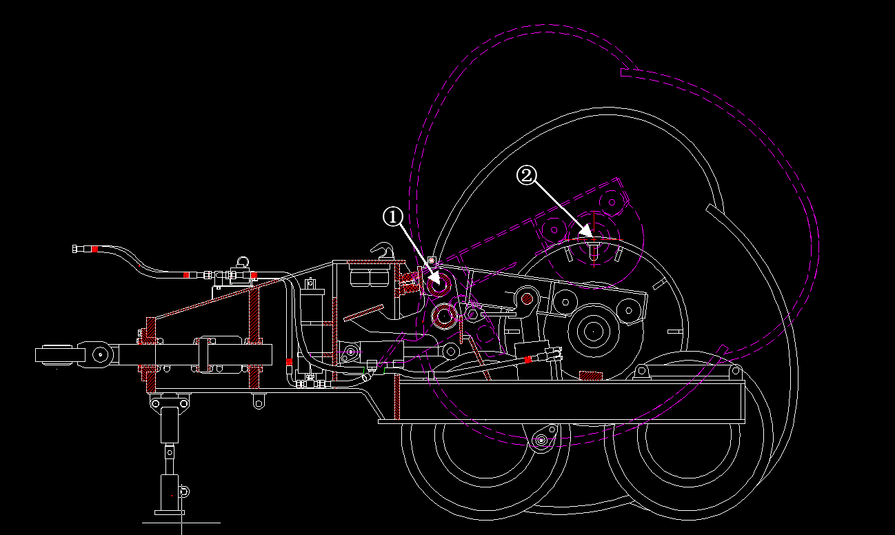 液壓千斤頂在使用時必須必須保證與荷重面垂直,其頂部與重物的接觸面間應(yīng)加防滑墊層。通過沖擊式壓路機設(shè)計圖紙(見圖1),可以看到,當沖擊壓實輪向上舉起時,整個大輪包括軸管都是沿著一個弧度方向上升的(見圖2),同時,千斤頂?shù)闹雾旤c(軸管)與千斤頂頂頭的接觸面很小,容易滑脫,造成重大安全事故!